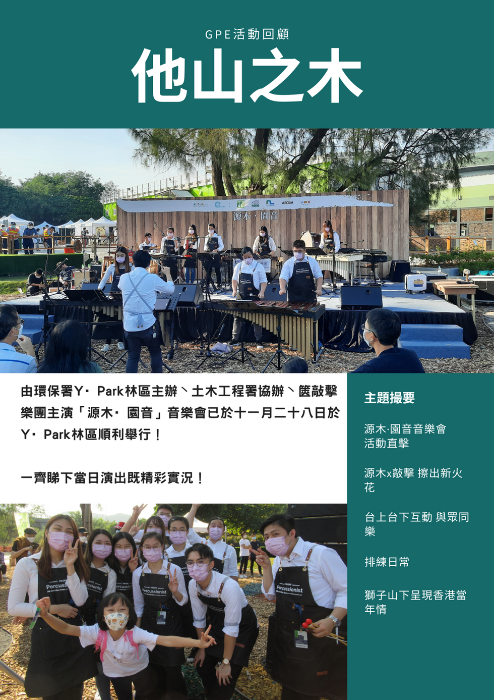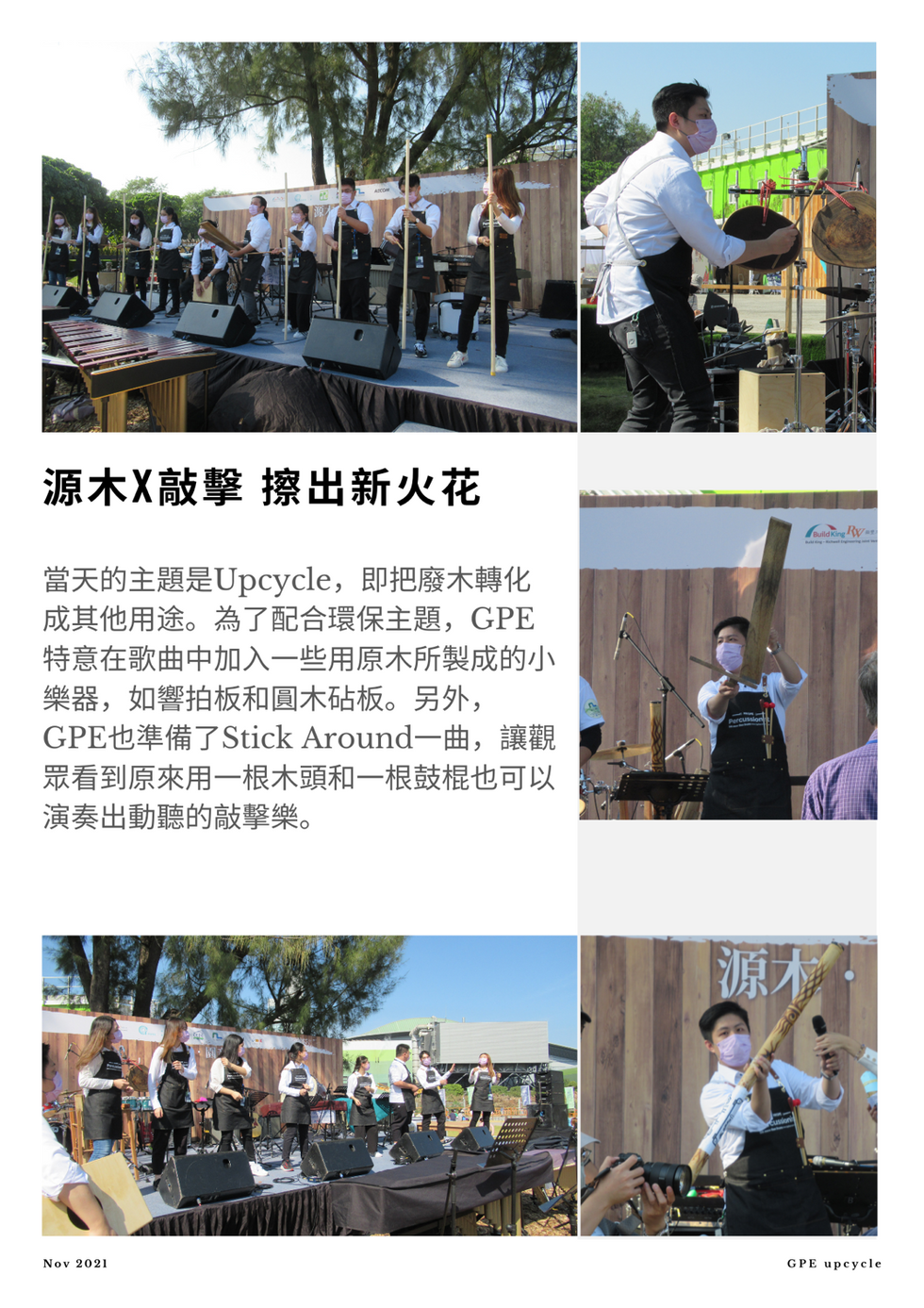 「篋敲擊」樂團參與:Gip Percussion Ensemble(篋敲擊樂團)運用由回收園林物料製作的樂器,在活動中進行音樂表演,展現廢木在敲擊樂上的創意變奏。